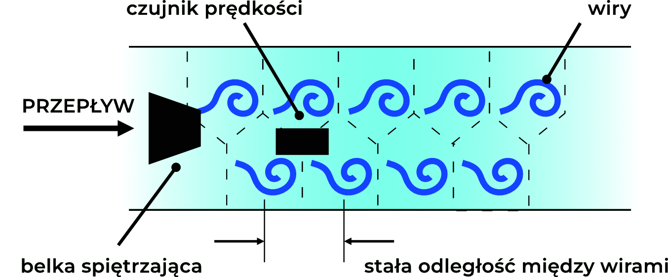 Przepływomierz wirowy FBVP Vortex wykorzystuje zjawisko powstawania wirów za przeszkodą w przepływie medium. Przegroda generuje wiry, które naprzemiennie odrywają się od jej brzegów. Częstotliwość odrywania wirów jest wprost proporcjonalna do średniej prędkości przepływu, a więc do strumienia objętości. Podczas odrywania wirów, po dwóch stronach przegrody, powstają naprzemienne chwilowe pola niskiego ciśnienia. Umieszczony za przegrodą czujnik wykrywa je, zlicza i przetwarza na linowy sygnał cyfrowy proporcjonalny do prędkości przepływającego medium. Na pomiar nie mają wpływu zmiana ciśnienia, gęstości, temperatury czy lepkości. Dlatego przepływomierz wirowy FBVP Vortex to uniwersalne urządzenie do pomiaru przepływu gazów, pary i cieczy.