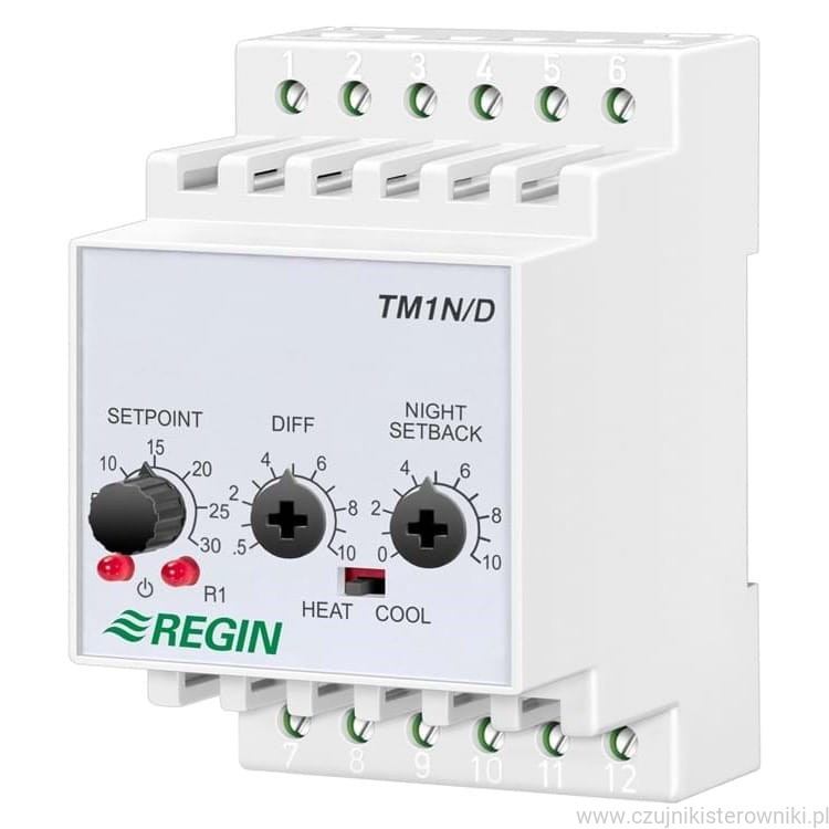 Termostat TM1N/D jest elektronicznym termostatem do sterowania aplikacjami ogrzewania lub chłodzenia. Jest przeznaczony do stosowania w połączeniu z czujnikami temperatury Regin NTC.